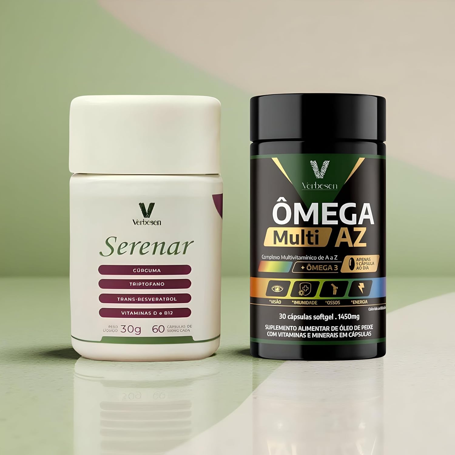 O Kit Saúde Verbesen reúne dois suplementos exclusivos desenvolvidos para quem busca mais qualidade de vida, energia e equilíbrio: Serenar: Suplemento natural especialmente formulado para auxiliar mulheres na menopausa. Contém triptofano, cúrcuma, vitaminas, minerais e ativos naturais que promovem equilíbrio emocional, bem-estar físico e ajudam a reduzir sintomas como ondas de calor, irritabilidade e insônia. Ômega Multi AZ: Fórmula completa com 21 vitaminas, minerais e Ômega-3 que contribuem para a saúde cardiovascular, memória, concentração e imunidade. Ideal para manter corpo e mente em pleno funcionamento. Combinados, Serenar e Ômega Multi AZ oferecem um suporte diário completo para a saúde da mulher, ajudando a viver essa fase com mais tranquilidade, energia e vitalidade.