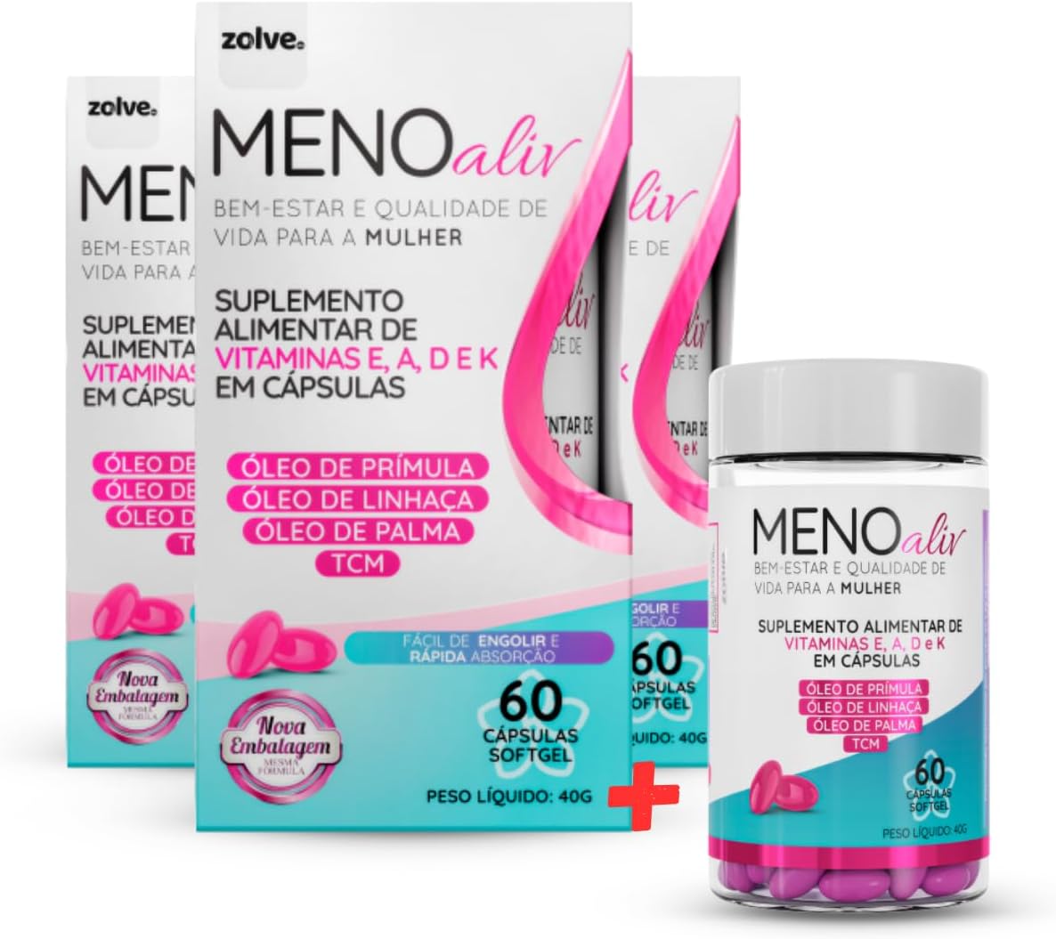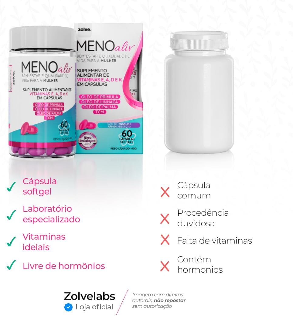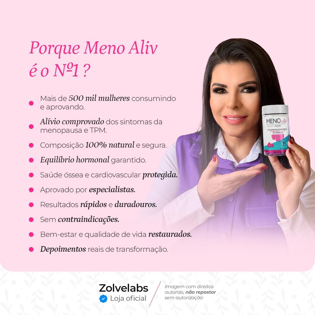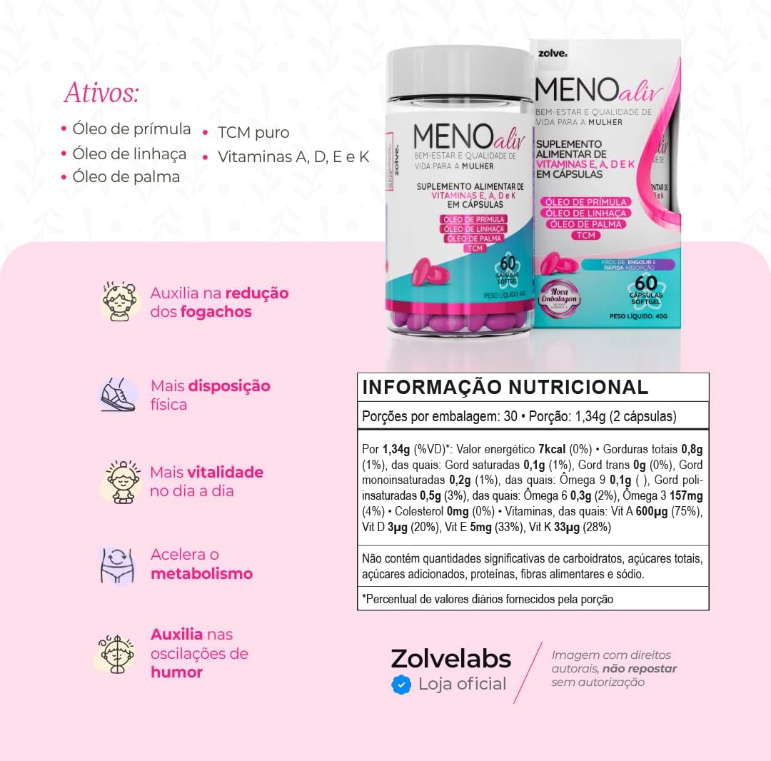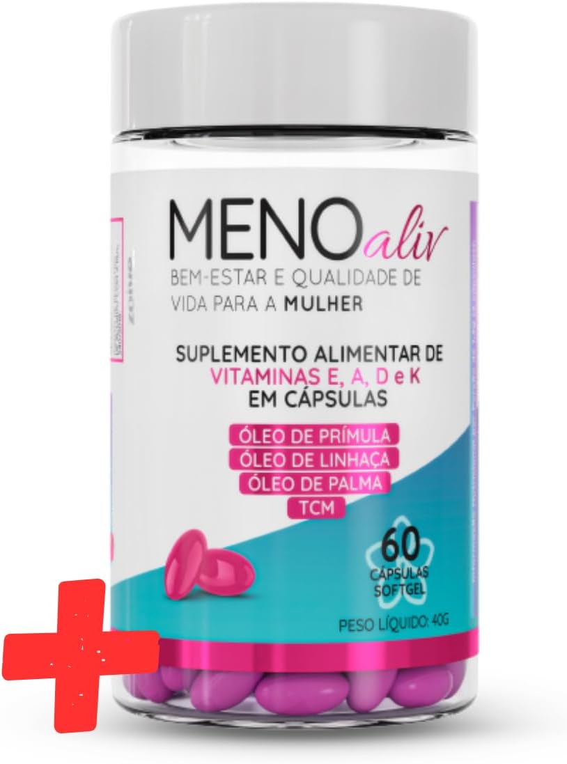 Meno Aliv é o seu aliado natural para atravessar a menopausa com conforto e equilíbrio. Formulado com óleo de prímula, óleo de linhaça e vitaminas A, D, E e K, este suplemento em cápsulas softgel oferece suporte essencial ao seu organismo feminino, sem ser um medicamento.